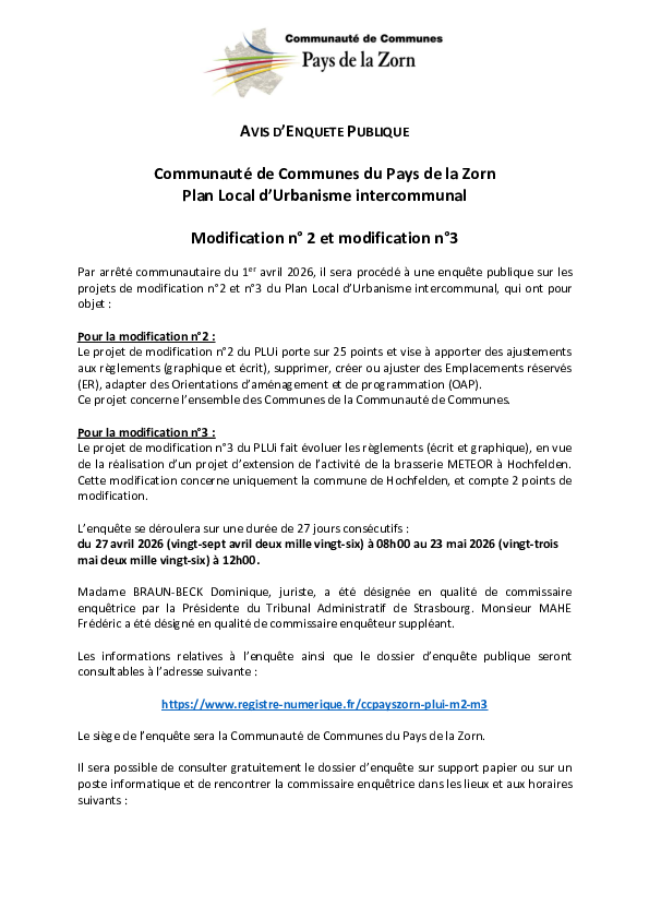 Par arrêté communautaire du 1er avril 2026, il sera procédé à une enquête publique sur les projets…